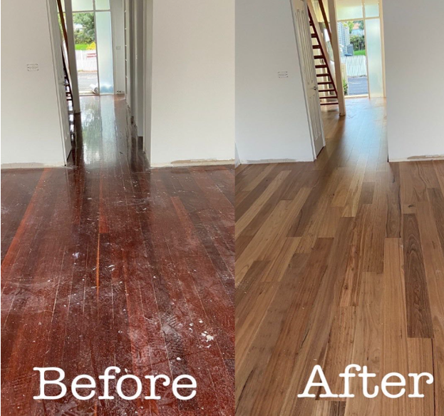 The process of changing floor colour starts with sanding. Sanding removes the existing finish and exposes the raw timber underneath. This creates a clean surface that can absorb new stains or finishes evenly.