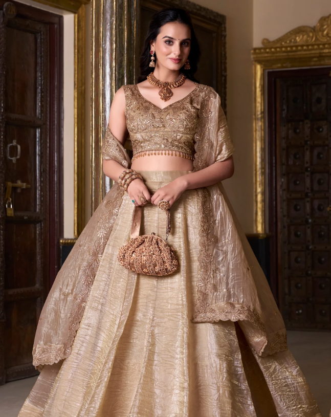 Detailed craftsmanship adds depth and character to traditional attire. The embroidered lehenga reflects this artistry through its intricate patterns and textures.